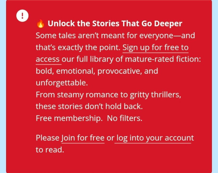 Davide Posted March 18 Posted March 18 (edited) 7 minutes ago, Lee Wilson said: At twelve, you could still read, you just can’t sign up. This is what happens if you try to read a story marked as mature while not being logged in. And yes, I logged out just to take a screenshot and logged back in. Edited March 18 by Davide 3 Quote
